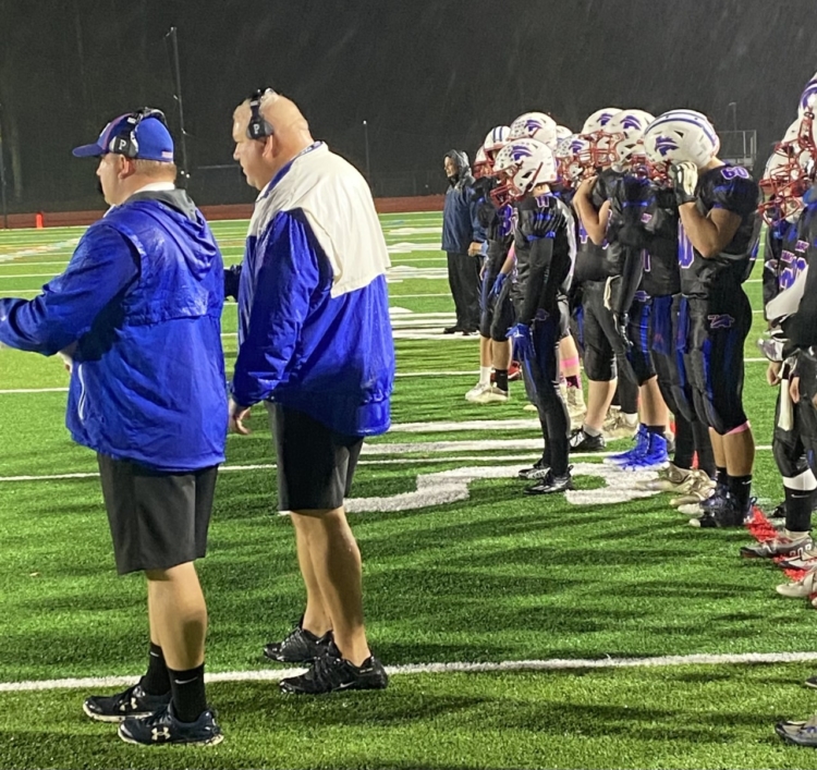 Mt. Ararat football coach Frank True, front right, stands with assistant coach and son, Frankie True, during an eight man Large School North-South crossover game against Waterville on Friday night. Bill Stewart/Kennebec Journal