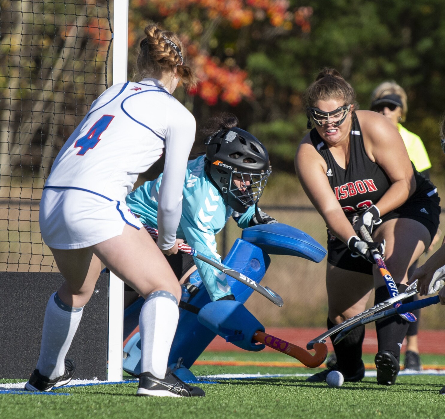 Mt. Ararat back Lucy Jackson, left, and goalie Piper Cohen look to prevent Lisbon’s Emily Libby from scoring during a field hockey play day Wednesday in Topsham. Joe Phelan/Kennebec Journal