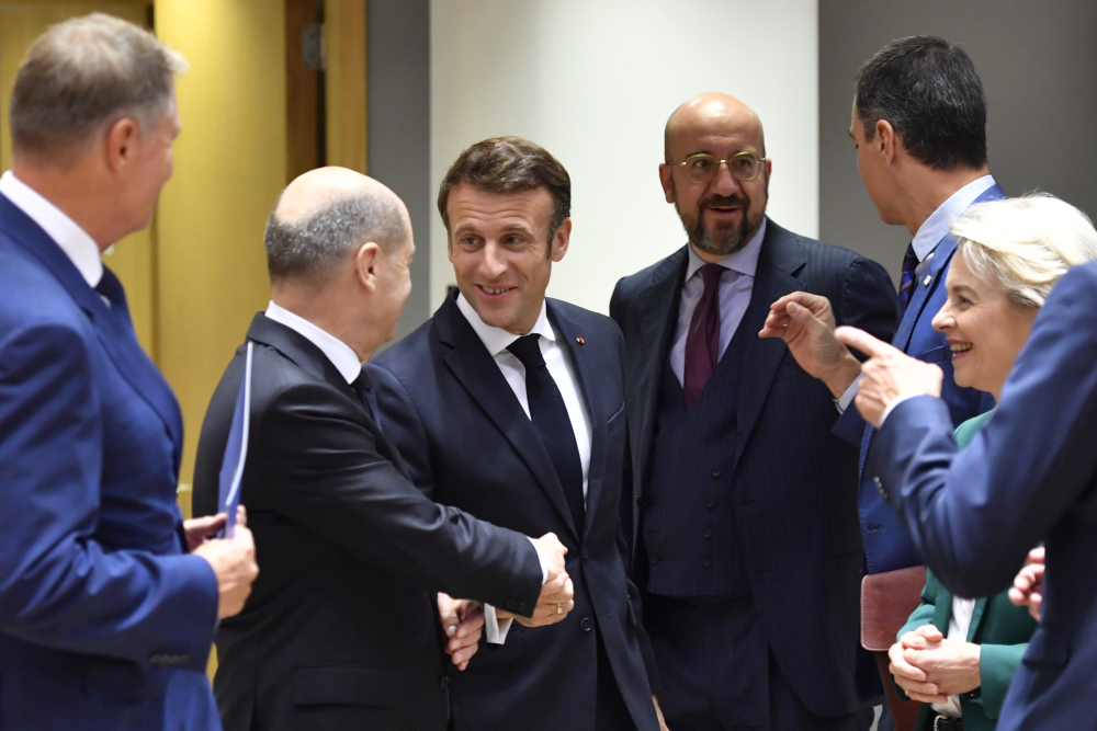 From left, Romania’s President Klaus Werner Ioannis, Germany’s Chancellor Olaf Scholz, France’s President Emmanuel Macron, European Council President Charles Michel, Spain’s Prime Minister Pedro Sanchez and European Commission President Ursula von der Leyen during a round table meeting at an EU summit in Brussels, Friday. Geert Vanden Wijngaert/Associated Press