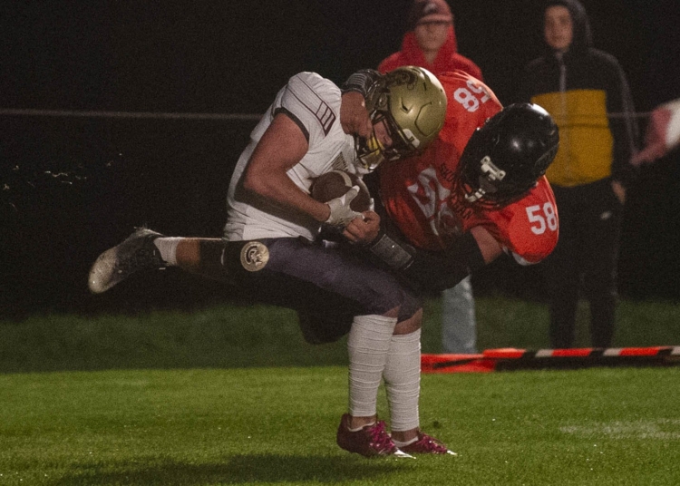 Skowhegan’s Kyle LePage (58) tackles Thornton Academy’s Henry Lausier (14) during a football game last Saturday in Skowhegan. Michael G. Seamans/Morning Sentinel