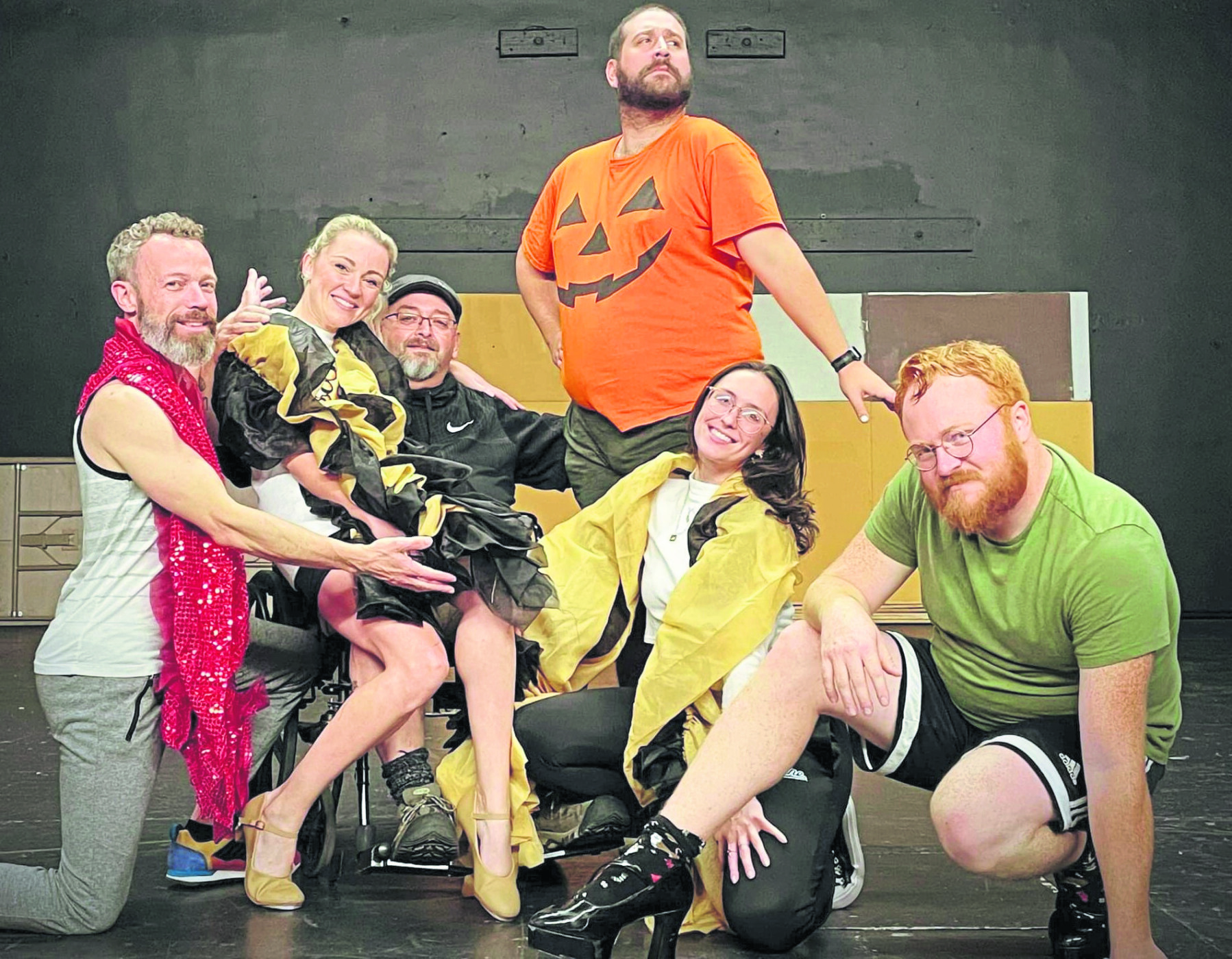 “The Rocky Horror Show LIVE!” will be performed at Community Little Theatre October 27-29. Pictured here left to right at a recent rehearsal are cast members Josh Caron as Rocky; Danielle Eaton, Columbia; Tony Roy, Dr. Scott; Justin Morin, Frank’n’Furter; Bryce Smith, Janet; and Cody Watson as Brad. Submitted photo