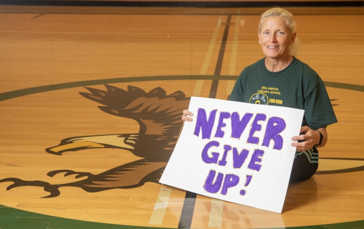 Physical education teacher Linda Peterson holds a sign Wednesday that students made to encourage people participating in the 25th annual Fun Run at Chelsea Elementary School. The fun run will take place Saturday during the school’s Harvest Festival from 2-4 p.m. Joe Phelan/Kennebec Journal