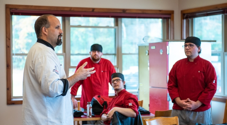 Austin Perreault, chef and instructor at Central Maine Community College in Auburn, talks to students Tuesday about what they will be doing for the day’s lesson. Russ Dillingham/Sun Journal
