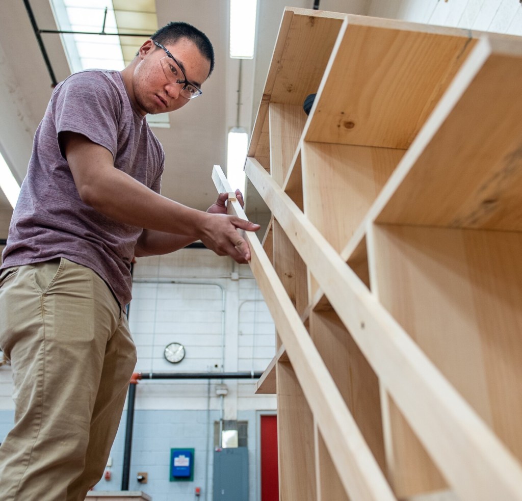 Students can choose from two degrees in the program, an in-house track and a job-site track. Caputo said the in-house students spend their two years in the classroom shop working on projects and in the outdoor classroom where there are five full-sized foundations on which they build full-sized houses.
