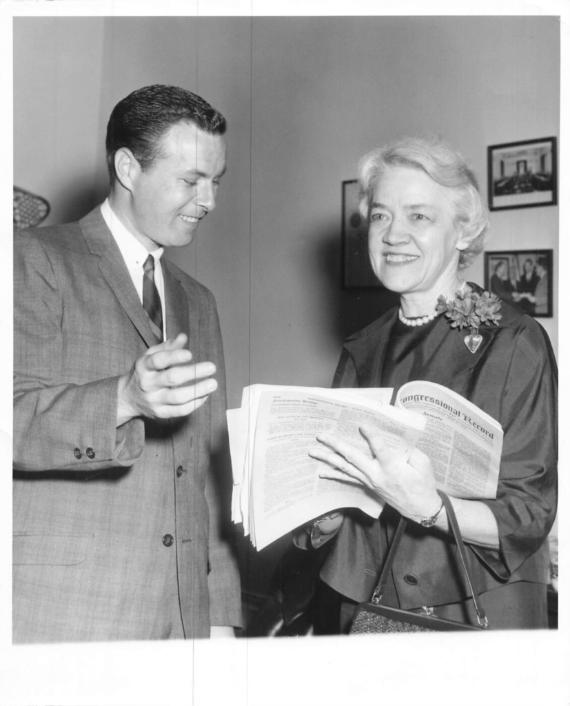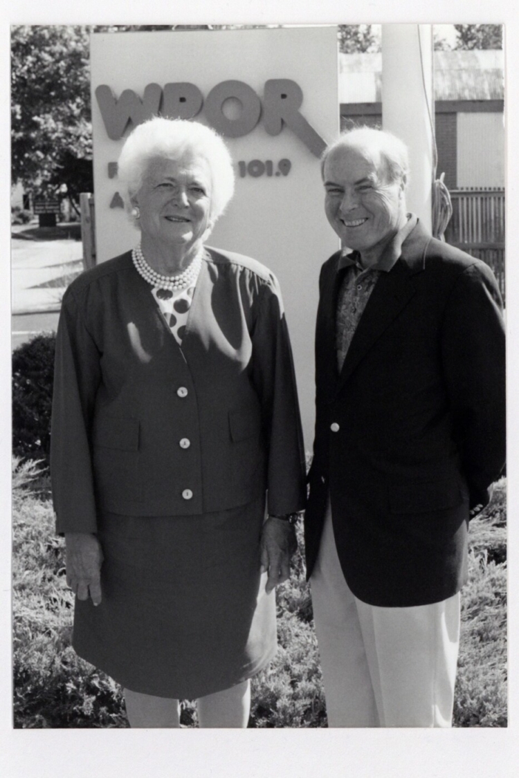 Bob Gold, right, with first Lady Barbara Bush in front of his Portland country radio station, WPOR. Photo courtesy of Kimberly Sheppard