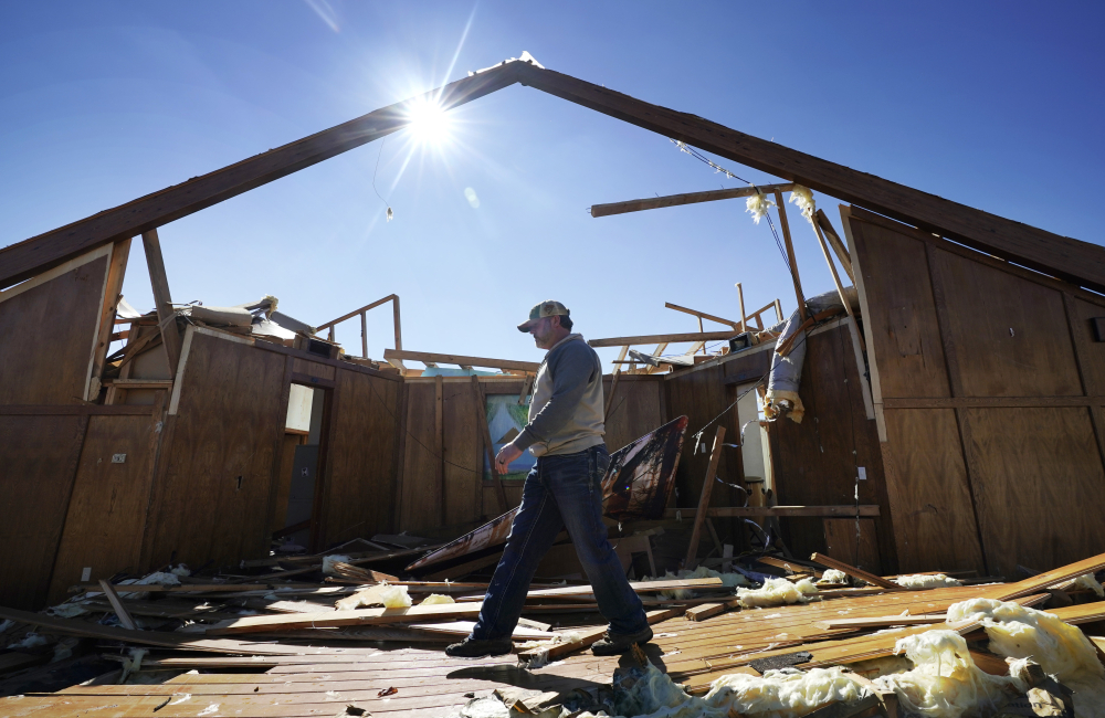 Danny Palmer, a deacon at Trinity Baptist Church, walks across the destroyed church’s sanctuary Saturday while looking for items to salvage after a tornado hit Idabel, Okla. LM Otero/Associated Press