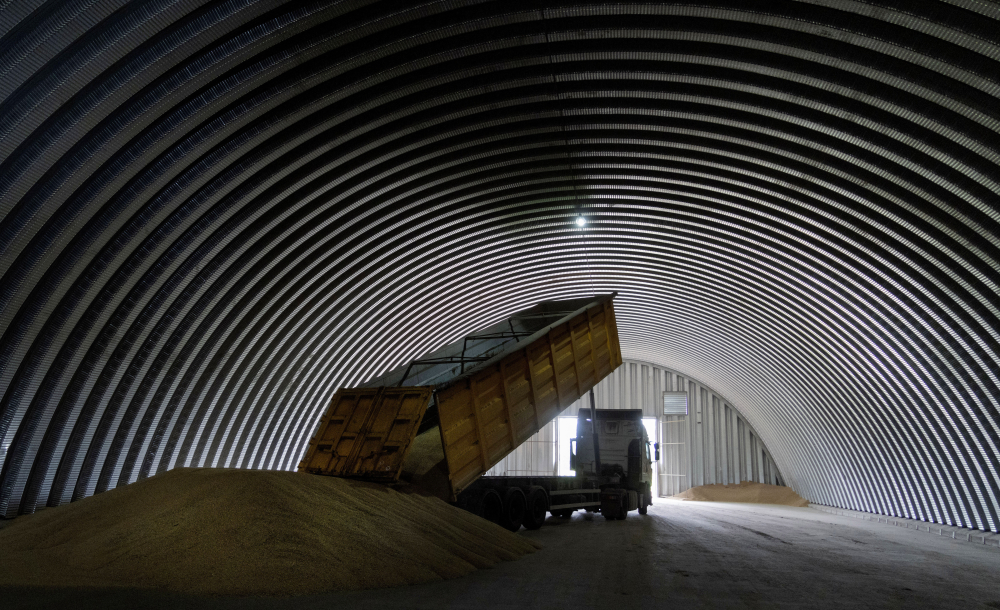A dump truck unloads grain in a granary in the village of Zghurivka, Ukraine, Aug. 9, 2022. A wartime agreement that allowed grain shipments from Ukraine has been extended by 120 days. Efrem Lukatsky/Associated Press, file