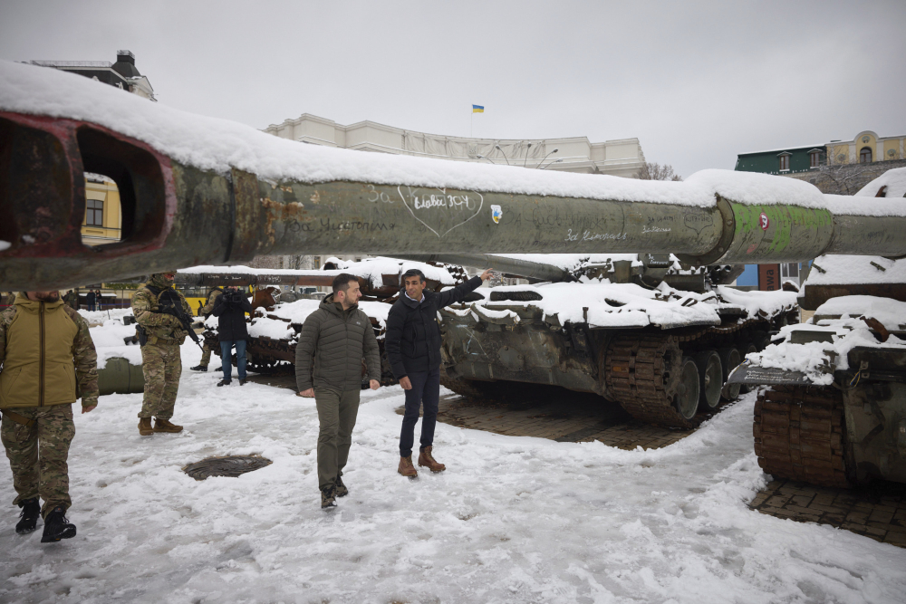 Ukrainian President Volodymyr Zelensky, left, and British Prime Minister Rishi Sunak observe destroyed Russian military vehicles installed in downtown Kyiv, Ukraine on Saturday. Ukrainian Presidential Press Office via AP