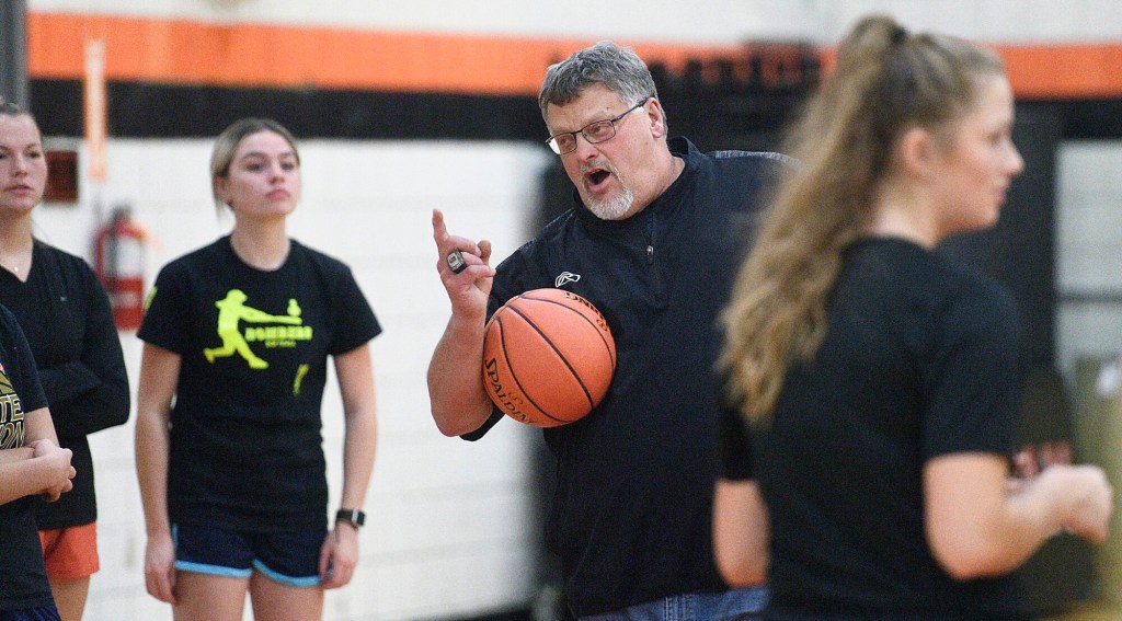 Skowhegan girls basketball coach Mike LeBlanc runs talks to players during practice Monday in Skowhegan. Andy Molloy/Kennebec Journal