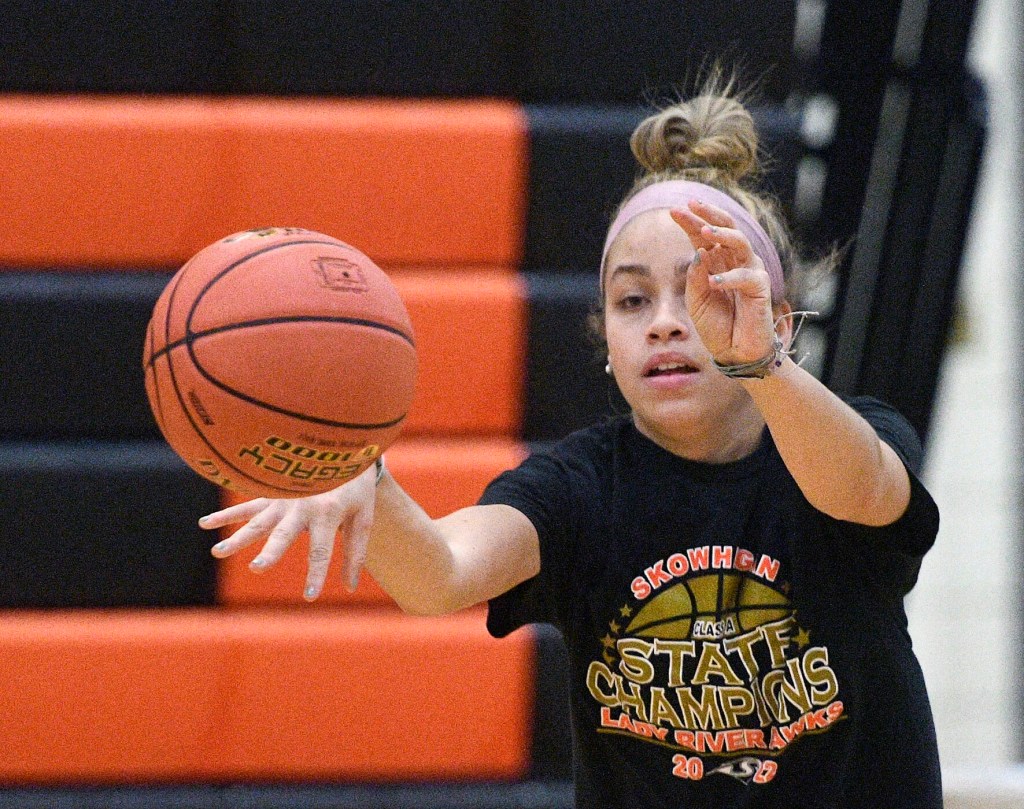 Skowhegan basketball player Aryana Lewis passes the ball during practice Monday in Skowhegan. Andy Molloy/Kennebec Journal