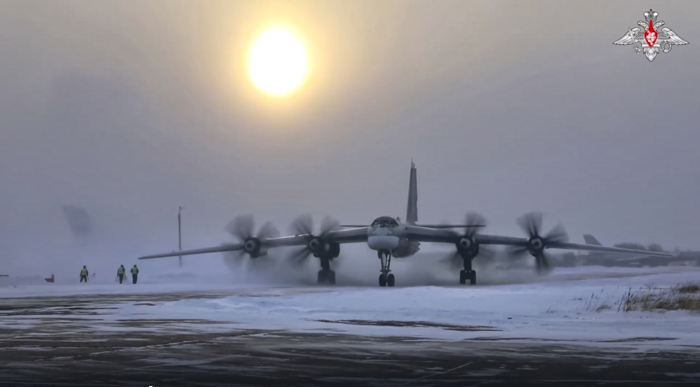 In this handout photo taken from video released by the Russian Defense Ministry Press Service on Wednesday, Nov. 30, 2022, a view of a Tu-95 strategic bomber of the Russian air force taxiing before takeoff for a joint air patrol with Chinese bombers at an airbase in an unspecified location in Russia. Russian Defense Ministry Press Service via Associated Press