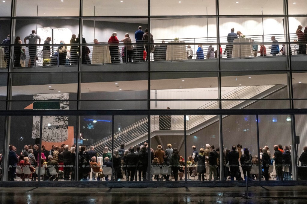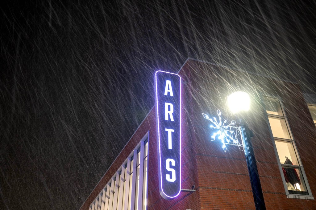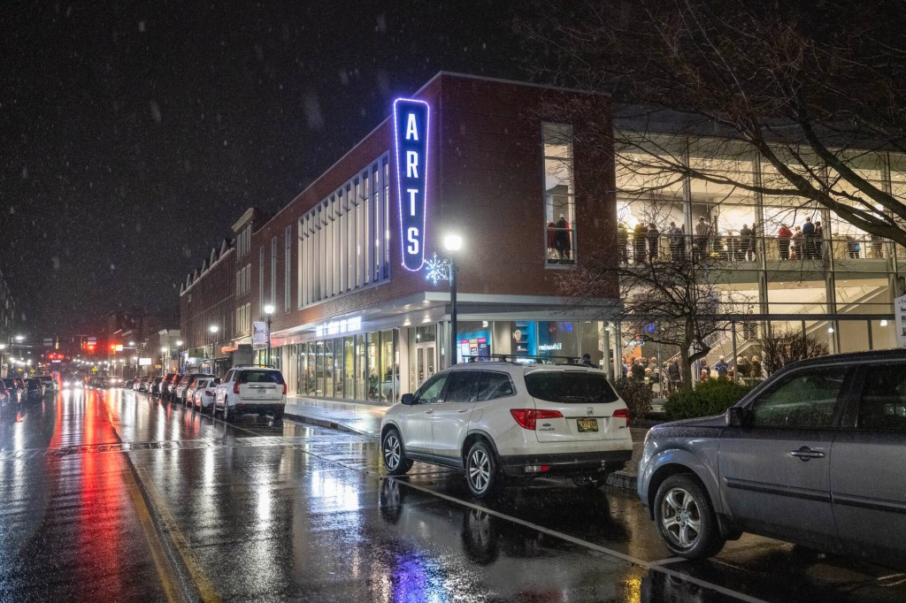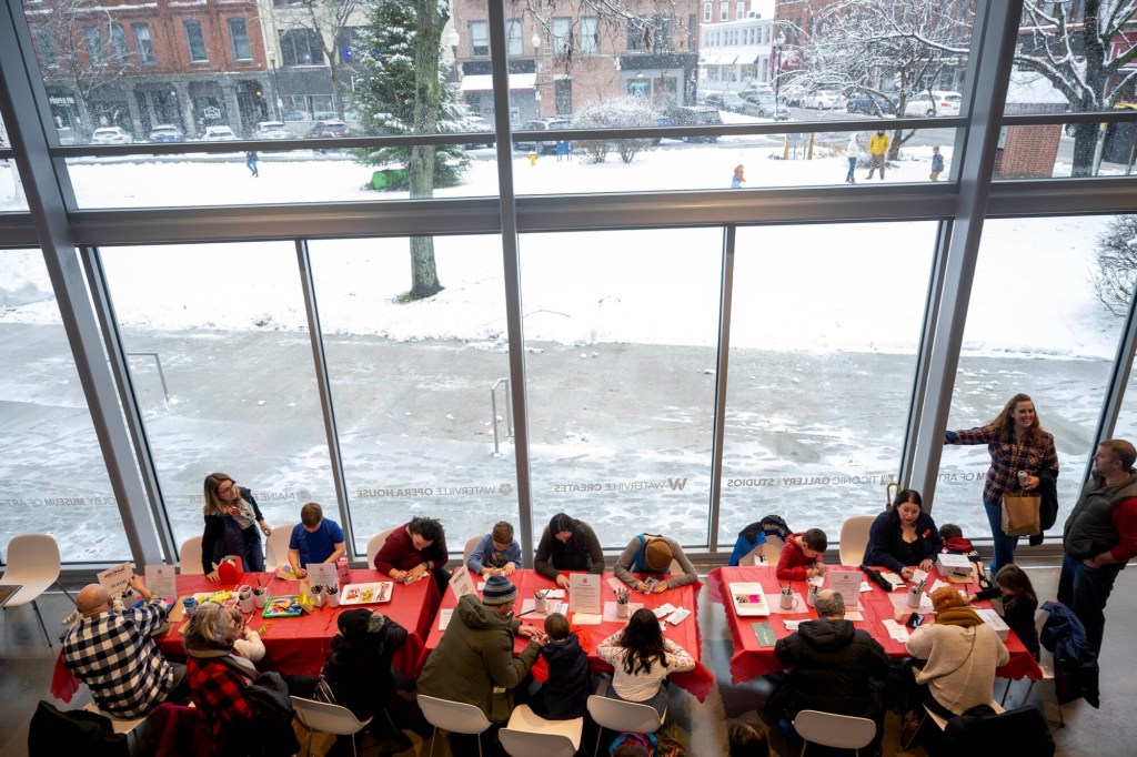 WATERVILLE — It was a like a scene out of an Edward Hopper painting, the snow falling outside the Paul J. Schupf Art Center downtown, all lit up inside, with children and adults milling about, creating art projects and sipping hot chocolate drinks at tables by a glass curtain overlooking the city square.