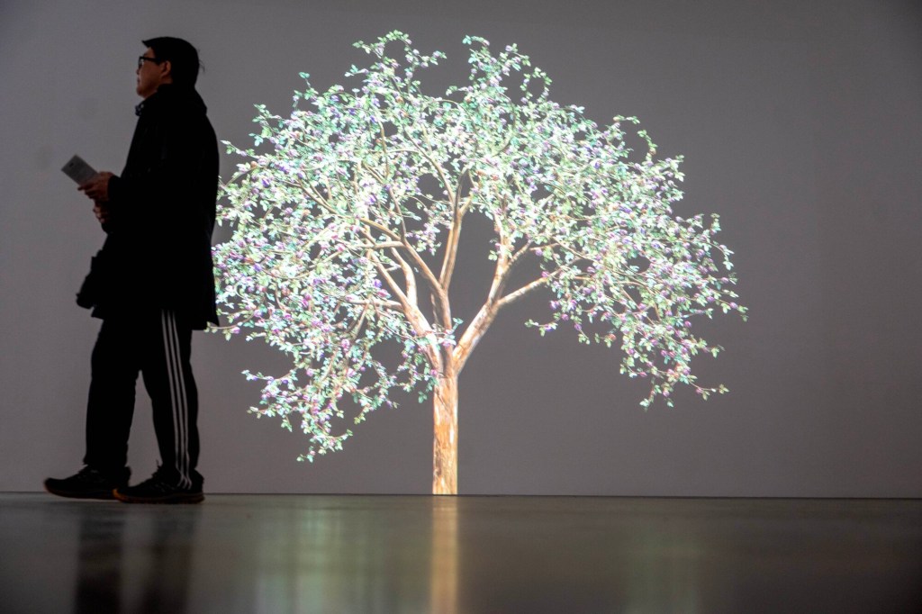 Digital art works from Light on Main Street digital art exhibit are shown on the wall at the Paul J. Schupf Arts Center during the “Joy to the Ville” event Saturday in Waterville. Michael G. Seamans/Morning Sentinel