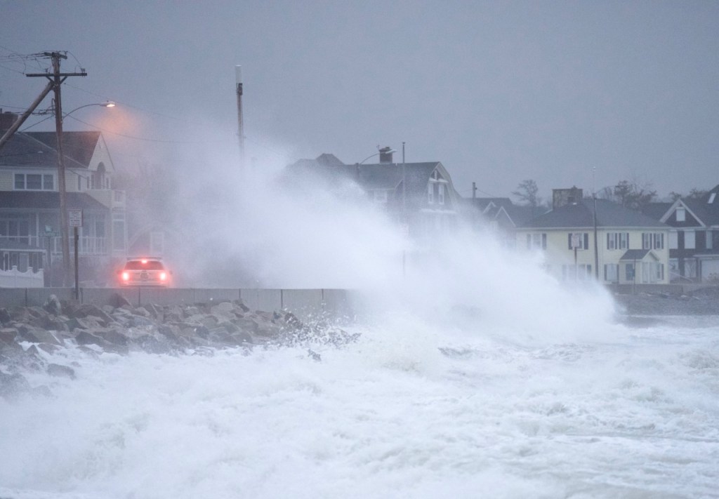A wave crashes over a car traveling along Beach Avenue in Kennebunk two hours before high tide on Friday morning. Gregory Rec/Staff Photographer