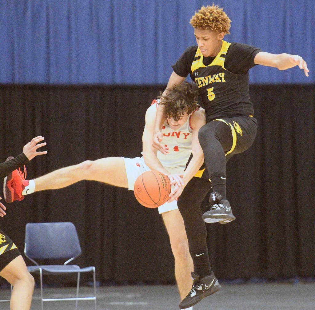 Cony’s Alex Fournier and Fenway’s Jhoscar Ortize go head-to-head during a boys basketball game Wednesday at the Capital City Hoop Classic in Augusta. Andy Molloy/Kennebec Journal