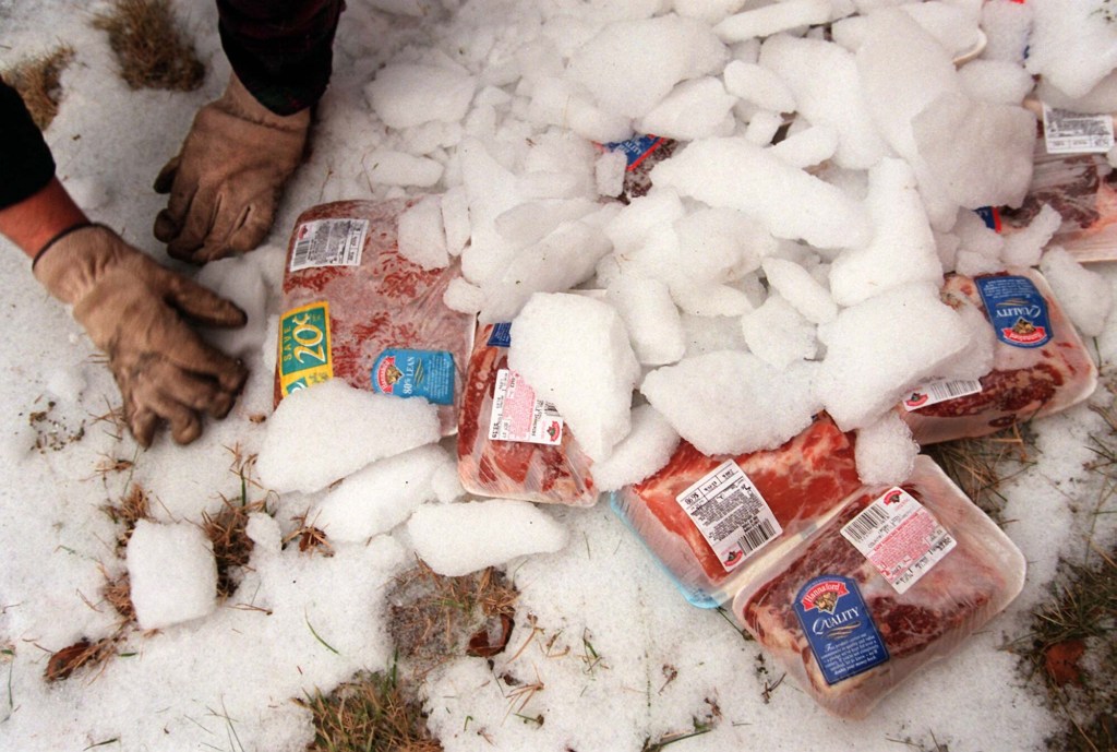Many people throughout Washington County lost the meat stored in their deep freezers after the power went out. Adam Thompson of Cape Split in South Addison resorted to storing his meat outside under chunks of ice, which was in plentiful supply. Gregory Rec/Press Herald