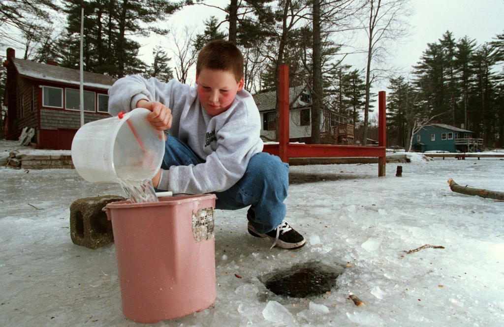 Toby Winkler, 13, gets water from a hole in the ice of Pettingill Pond. Winkler takes the water back to his home on Angler Road in North Windham to use when flushing the family toilet. John Ewing/Press Herald