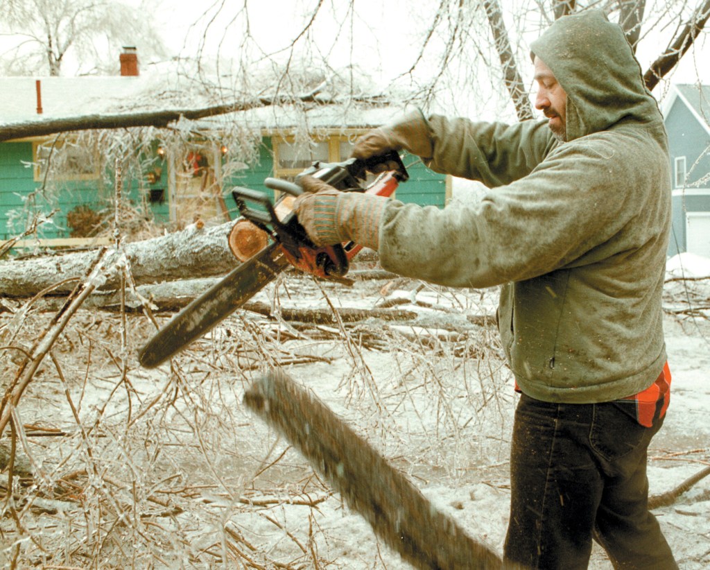 Jewel McHale of Route 115 in Yarmouth cuts up one of the many trees that broke under the weight of the ice at her home. Although beautiful to look at, the ice storm caused a lot of damage to trees, wires and homes in the state. Gordon Chibroski/Press Herald