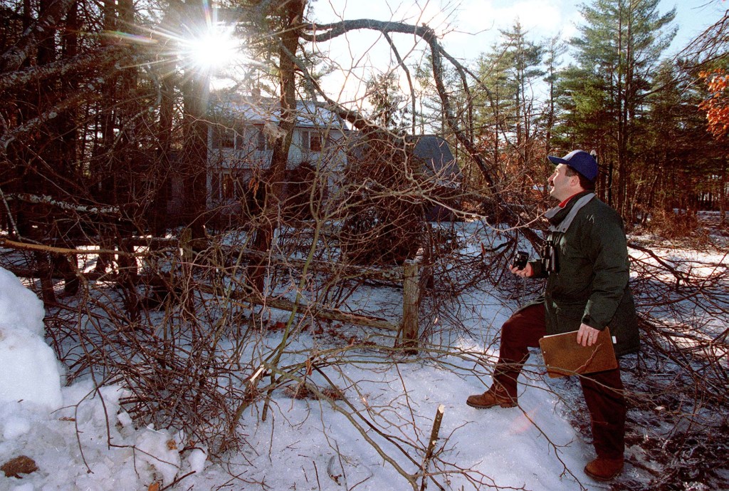 A Farmingdale town official inspects ice damage to trees and power lines along Sheldon Street. Gordon Chibroski/Press Herald