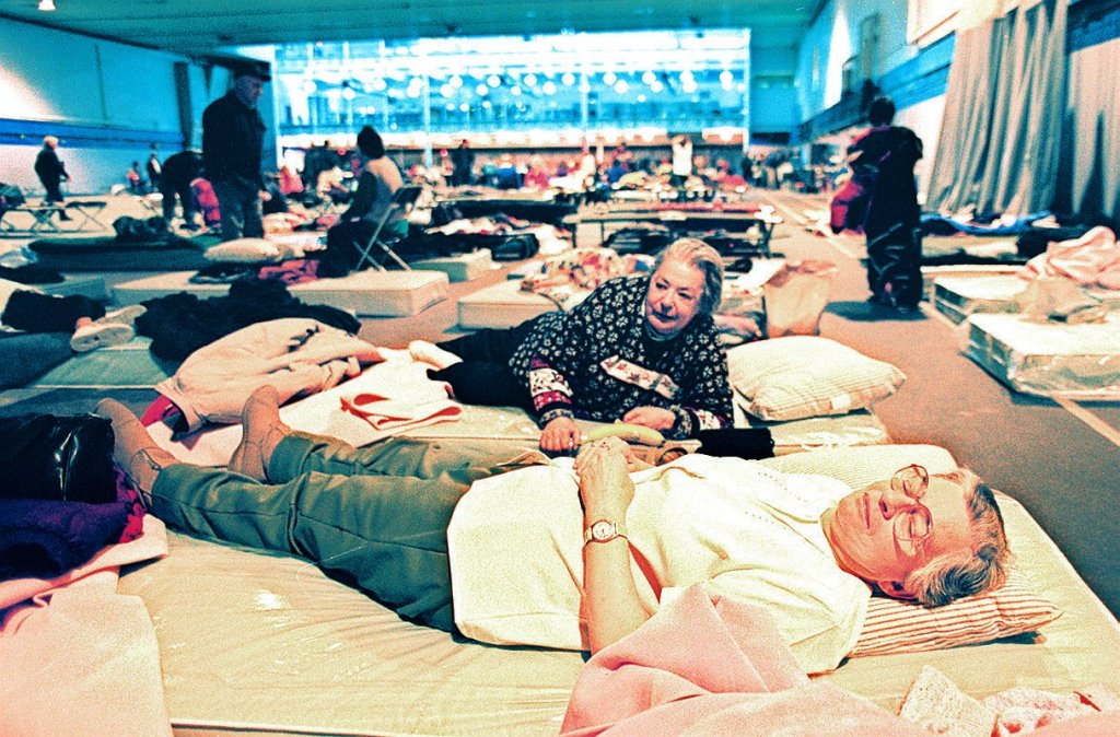 Connie Hoffman, foreground, and Rita Darling, both of Fairfield, try to rest at the emergency shelter at the Colby College Field House on Jan. 9 during the ice storm. David Leaming/Morning Sentinel