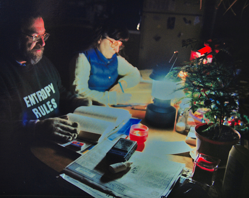 Eric and Polly Bartlett read by the light of a Coleman lantern in their home in Casco during the Ice Storm of 1998. Photo courtesy of Eric Bartlett