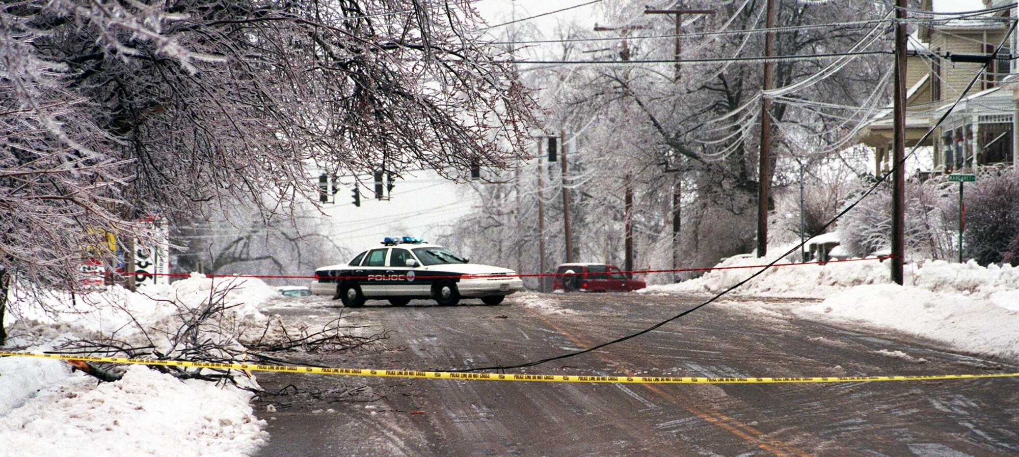A car travels down Turner Street in Auburn flanked by broken trees and utility poles. Russ Dillingham/Sun Journal