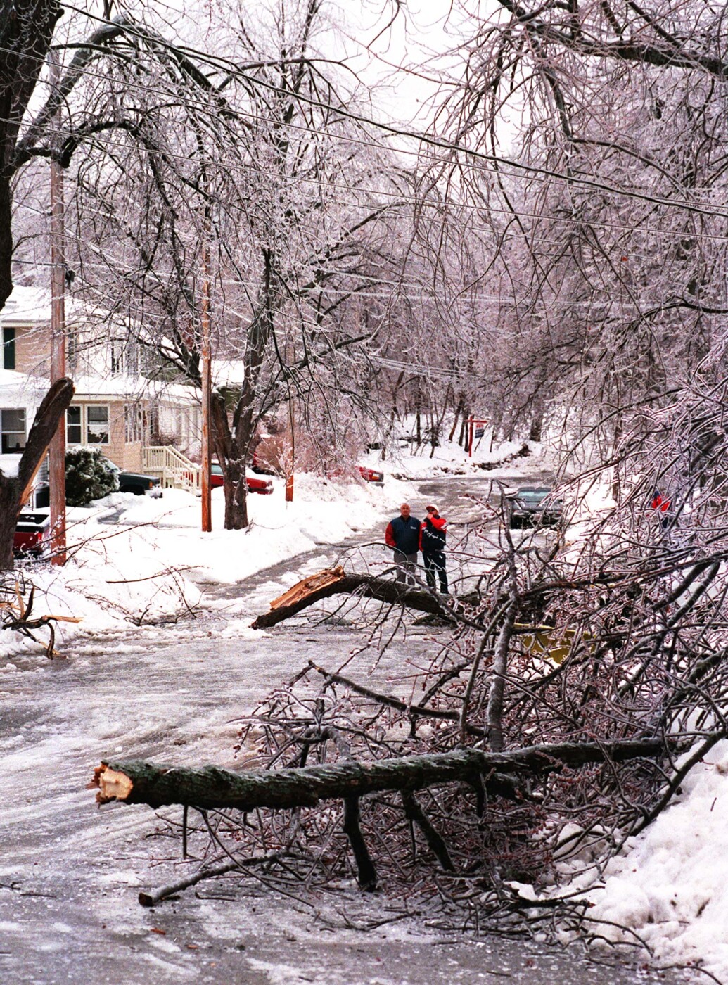 A couple out walking the neighborhood and surveying the damage from ice storm pass fallen limbs and down wires on Lincoln Street in Augusta. Joe Phelan/Kennebec Journal