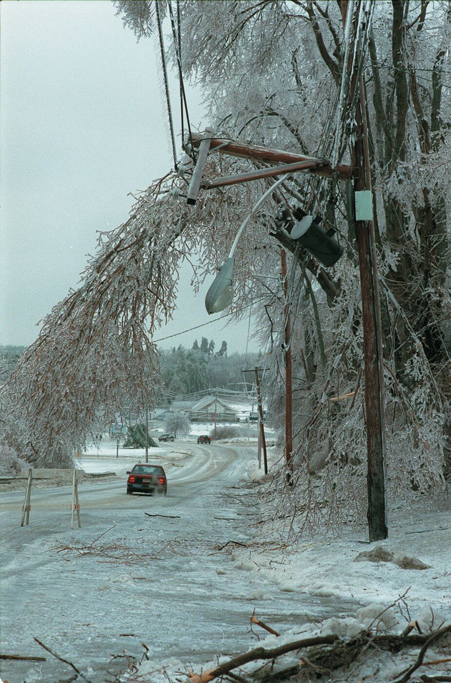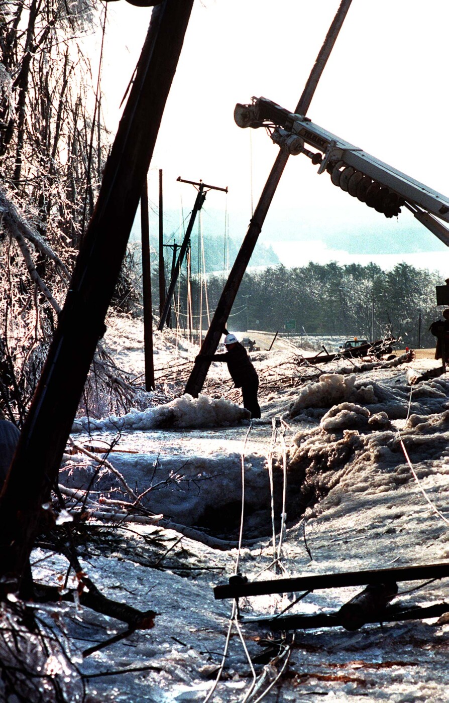 Linemen from Bell Atlantic work to replace a line of 12 poles knocked down alongside Route 201 in Gardiner during the ice storm. David A. Rodgers/Press Herald