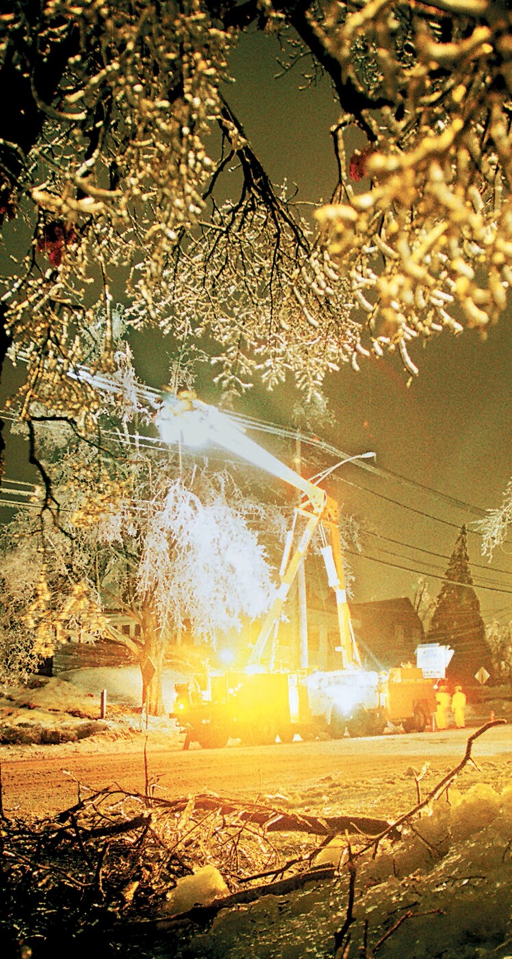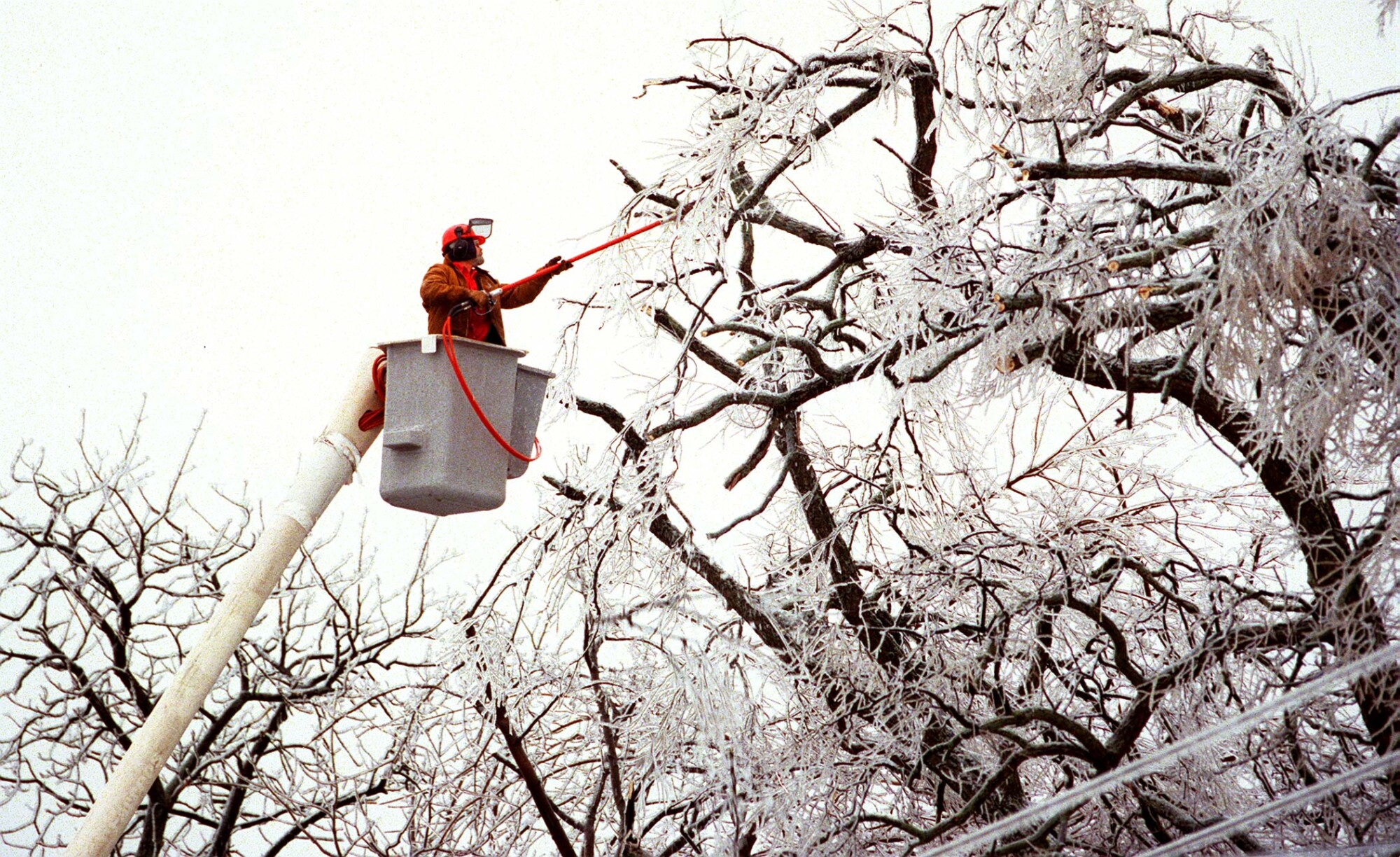 A Central Maine Power lineman works to remove a limb from an icy power line in Augusta on Jan. 8. Joe Phelan/Kennebec Journal