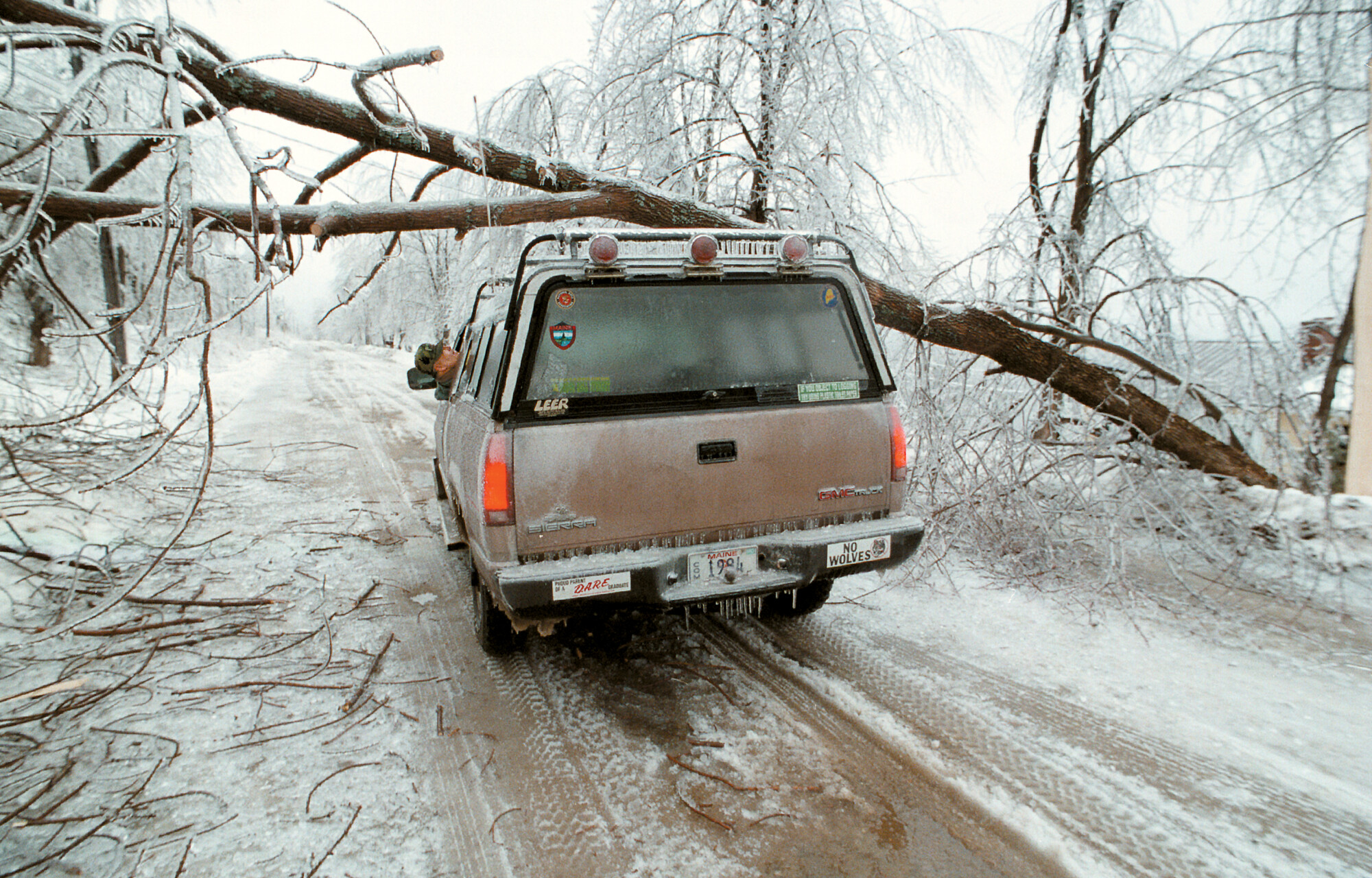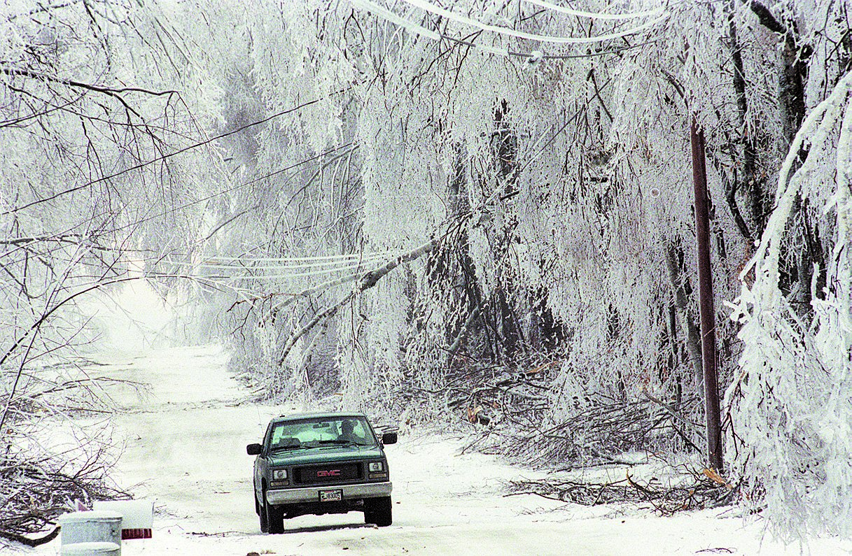 A letter carrier checks the clearance to make sure his truck can make it under a downed tree on Jan. 8 on Ridge Road in Norway. Russ Dillingham/Sun Journal