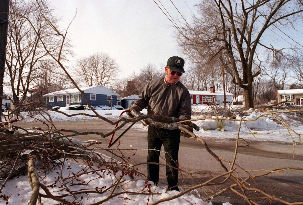 South Portland resident Rudy Ordway hauls and cuts tree limbs that covered his backyard to curbside to allow city crews to haul the limbs away from his State Avenue on Jan. 27, 1998. John Patriquin/Press Herald