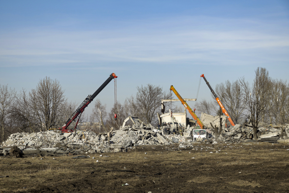 Workers clean rubble after Ukrainian rocket strike in Makiivka, in Russian-controlled Donetsk region, eastern Ukraine on Tuesday. Associated Press photo