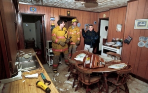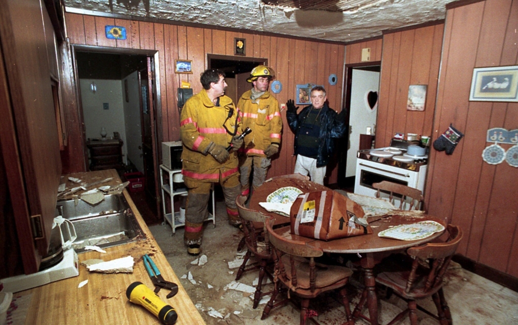 Tom Grenier, right, talks with Lewiston firefighters Jan. 16, 1998, in one of the apartments he owns at 33 Tampa St. in Lewiston. Pipes froze and burst during the ice storm when power was lost to the building. Russ Dillingham/Sun Journal file