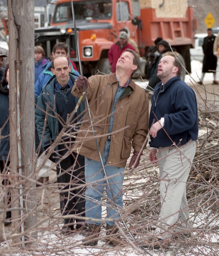 Despite the long-running electric company mantra, “No line is safe to touch, evah,” U.S. Vice President Al Gore tugs on a wire Jan. 15, 1998, as he surveys storm damage on Adams Avenue in Auburn about a week after the ice storm. Auburn Assistant City Manager Mark Adams is at right and U.S. Rep. John Baldacci, D-Maine, is behind them at left. Russ Dillingham/Sun Journal file