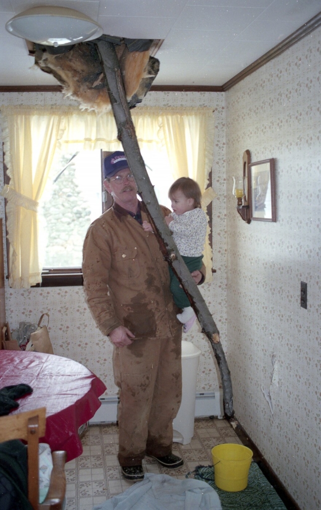 Dennis Newton and his 18-month-old granddaughter, Destiny Newton, look at the limb that punctured the roof of his house Jan. 11, 1998, on Worthley Pond in Peru. The limb sealed up the hole it created, so the family left it in place temporarily while removing other limbs of more immediate importance. Rich Plante/Sun Journal file