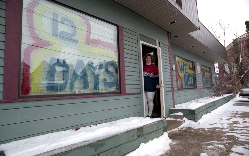 Bridget Cailler, the owner of Hairem on 111 Sabattus St. in Lewiston in 1998 when this photo was taken, stands beside a window Jan. 15 with the number of days the shop had been without power. Power was restored to the business after 15 days. Jose Leiva/Sun Journal file