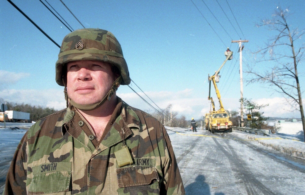 National Guard Sgt. Jeffrey Smith makes sure traffic does not interfere with line workers Jan. 11, 1998, as they repair downed utility poles in Auburn. Jose Leiva/Sun Journal file