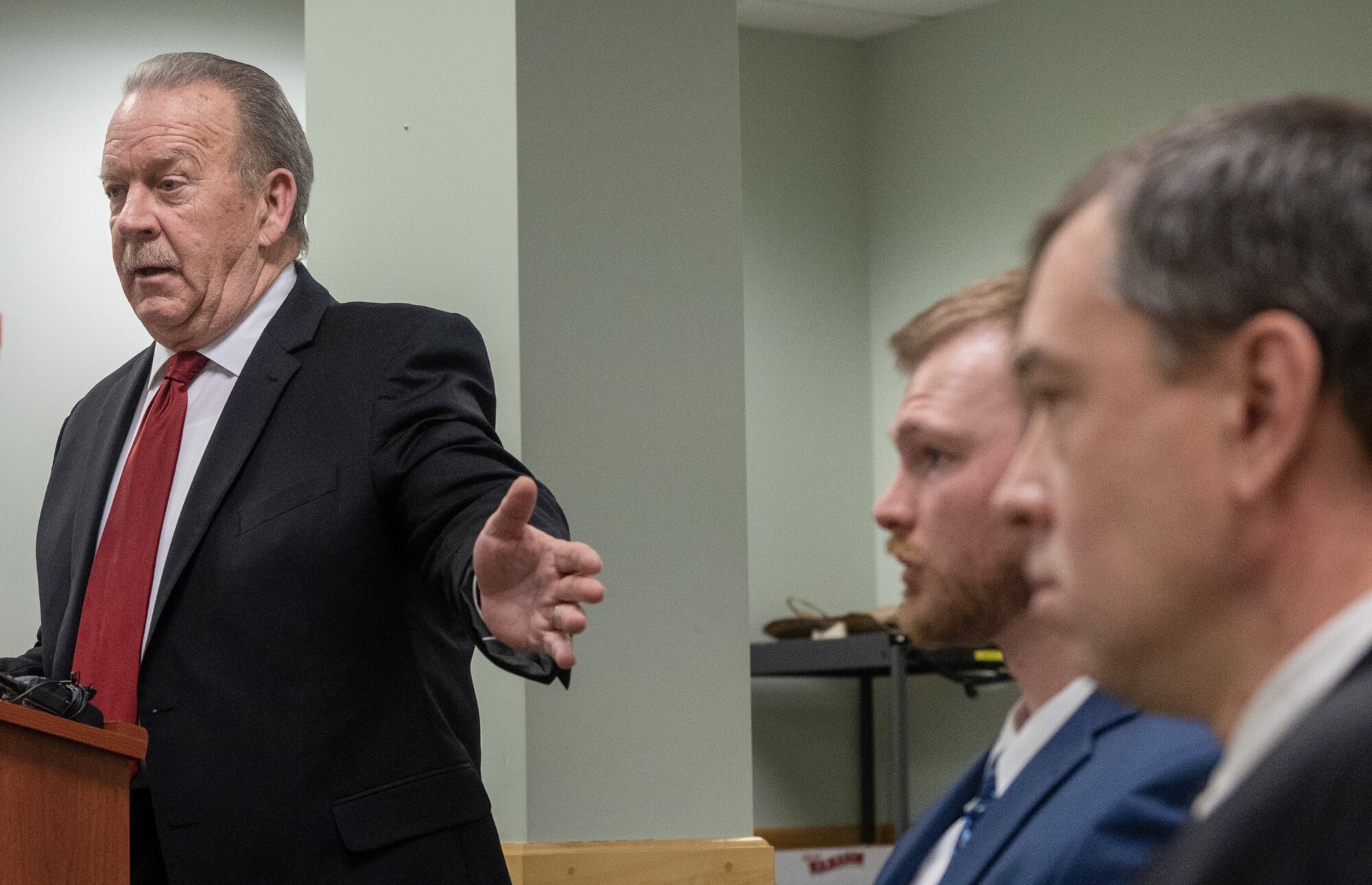 Gambling Control Unit Executive Director Milt Champion, left, is joined by sports wagering inspector Kyle Bourget and auditor Alex Joutov during a news conference about proposed rules for sports betting at the Department of Public Safety in Augusta on Wednesday. Joe Phelan/Kennebec Journal