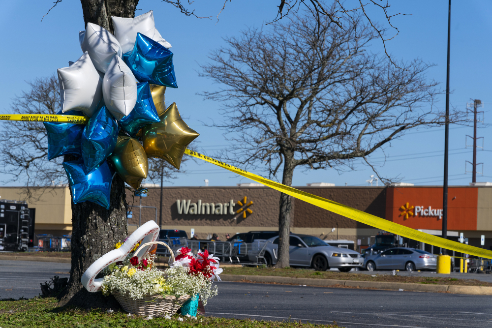 Flowers and balloons have been placed near the scene of a mass shooting at a Walmart on Nov. 23 in Chesapeake, Va. A Walmart manager opened fire on fellow employees in the break room of the Virginia store, killing several people. Alex Brandon/Associated Press file