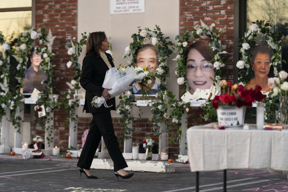 Vice President Kamala Harris visits a memorial set up outside Star Dance Studio in Monterey Park, Calif. on Wednesday, to honor the victims killed in last week’s mass shooting. Jae C. Hong/Associated Press