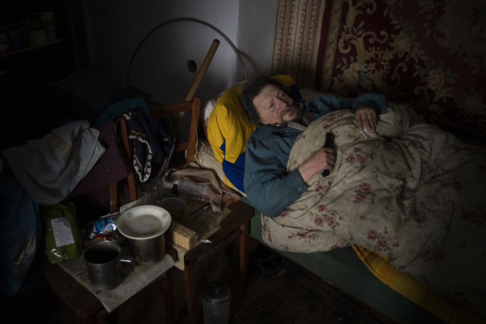 Suffering from cancer, Gennadiy Shaposhnikov, 83, rests in his partially destroyed home, which was hit by Russian shelling last fall in Kalynivske, Ukraine, on Saturday. Daniel Cole/Associated Press