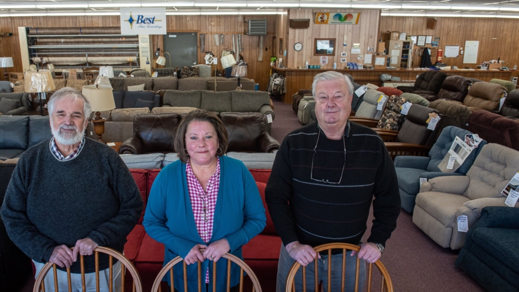 Jim Bouffard, right, owner of Bouffard’s Furniture & Carpet on Wilton Road in Farmington, stands Tuesday in the showroom with longtime employees Alton Kennedy and Laurie Blodgett. Bouffard announced he is closing the store in three or four weeks and retiring. Russ Dillingham/Sun Journal