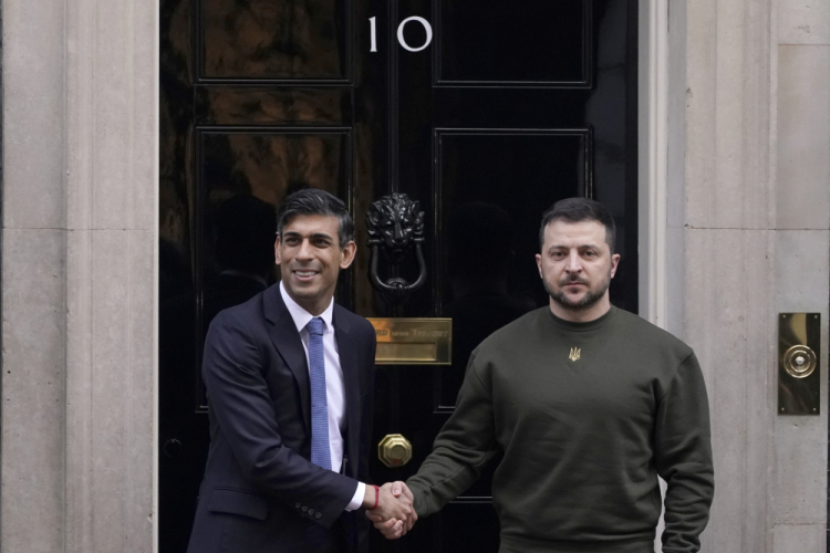 Britain’s Prime Minister Rishi Sunak, left, welcomes Ukraine’s President Volodymyr Zelensky at 10 Downing Street in London on Wednesday. Alberto Pezzali/Associated Press