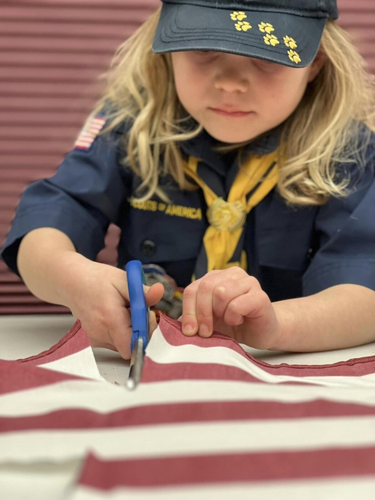Lion Cub Scout Delilah Howard cuts a flag. Submitted photo