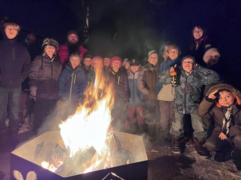 Gardiner Scouts from Pack 672 stands around a fire. From left are Cody St. Amand, Angel Vinton, Arthur Levitre, Andy Hopkins, Owen Campbell, Landon Harris, Declan Manion, Declan Noyes, Sawyer Guilmette, Delilah Howard, Owen Howard, Lana Pratt, Francesco Thouret, Mason St. Amand, Brittany St. Amand, Lucas Pratt and Woody Hopkins. Submitted photo