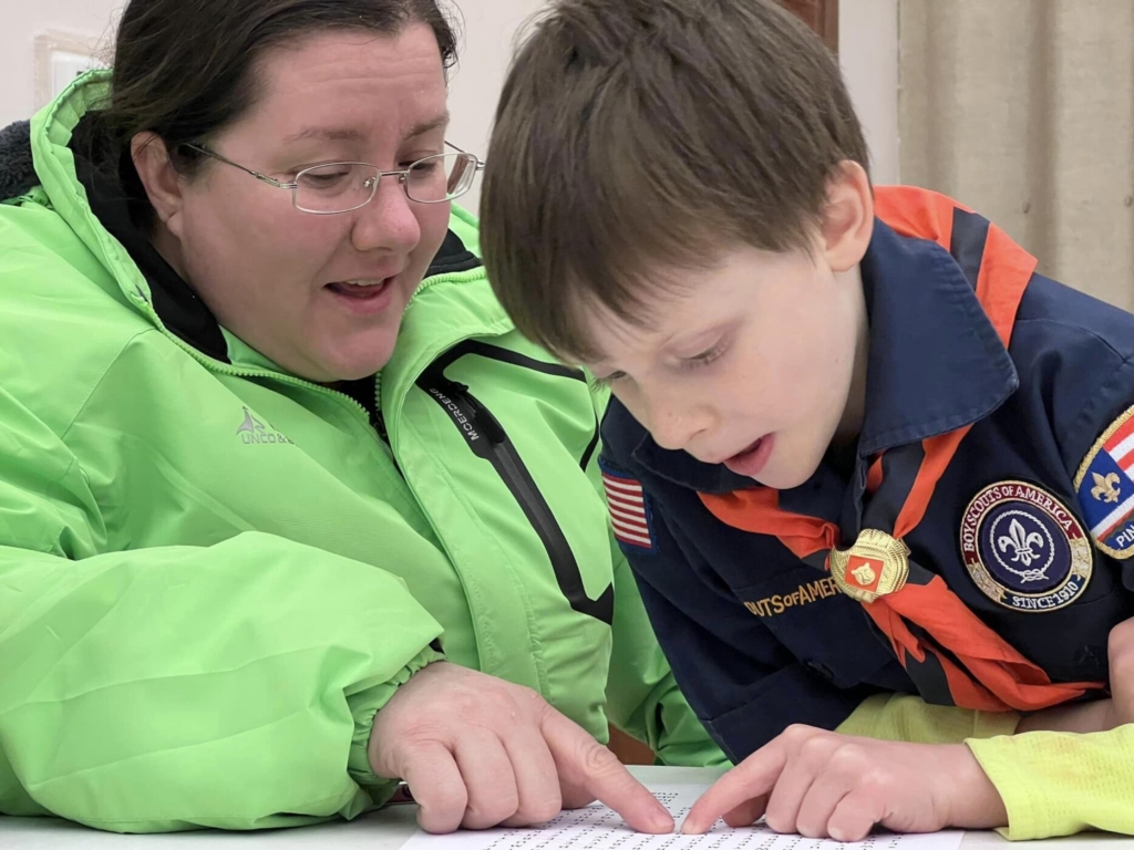 Karen and Sawyer Guilmette work on a “Cub Scout Find a Word.” Submitted photo