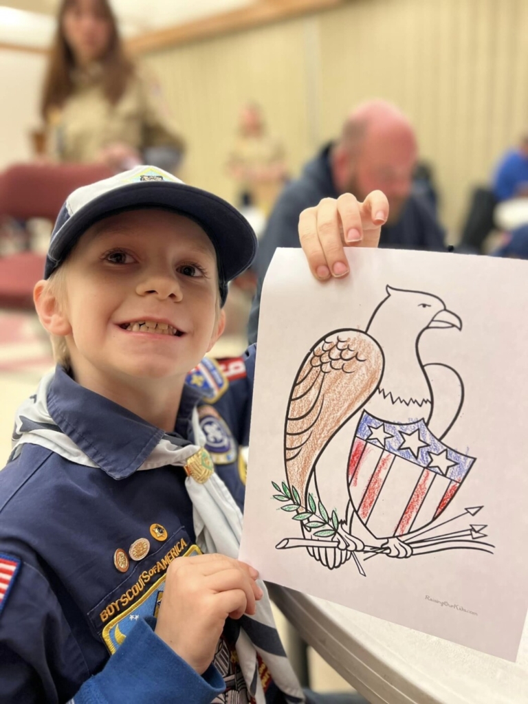 Bear Cub Scout Mason St. Amand holds up a coloring. Submitted photo