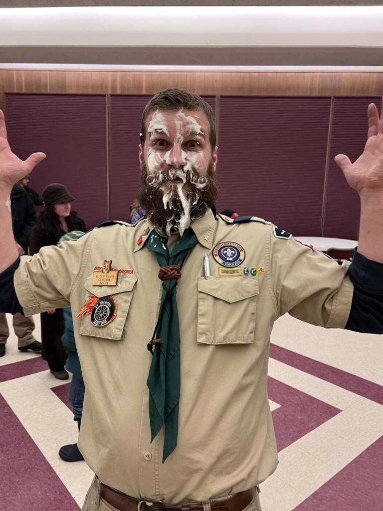Cubmaster Scott St. Amand after getting a pie to the face. Submitted photo