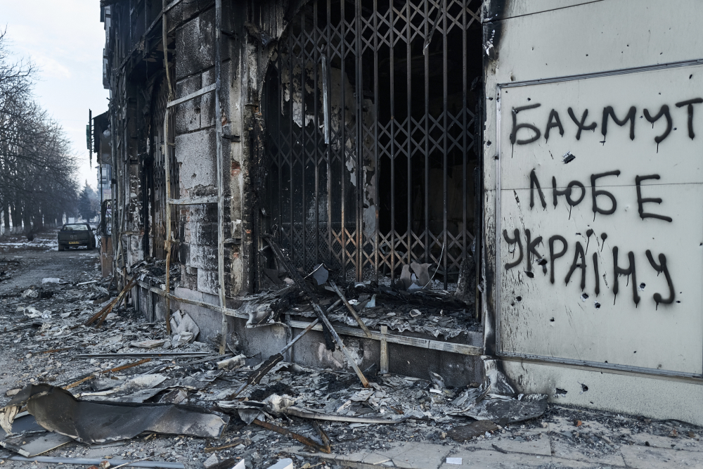 The city center damaged by Russian shelling Friday in Bakhmut, Donetsk region, Ukraine. Writing on the wall reads “Bakhmut loves Ukraine”. Libkos/Associated Press