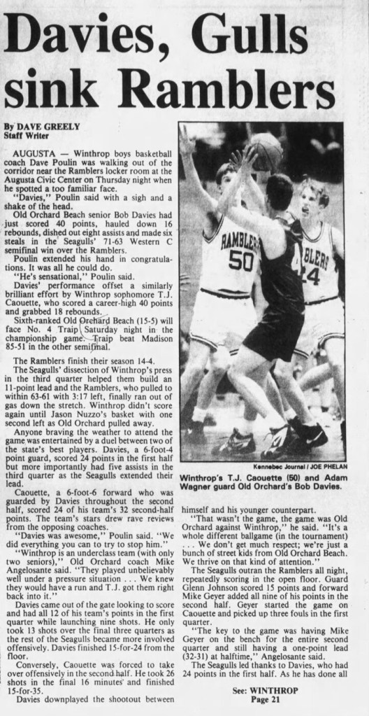 Davies — the current and longtime boys basketball coach at Thornton Academy in Saco — would win the Mr. Maine Basketball award that season. He led Old Orchard Beach to the Class C final. But the Seagulls fell 82-65 to Schenck High School.